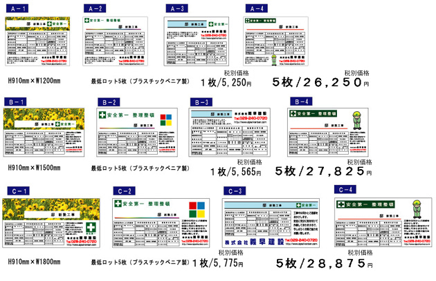 PR用オリジナルデザインの現場シート・養生シート 法定表示ボード 建築基準法による確認済・ 労災保険関係成立票・建設業の許可票を 完全自社製品にて日本全国、通信販売いたします。 |
